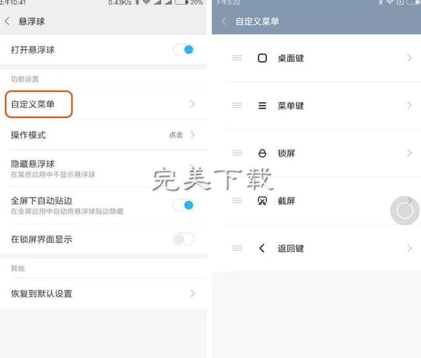 進入“懸浮球”設置界面,點擊“自定義菜單”