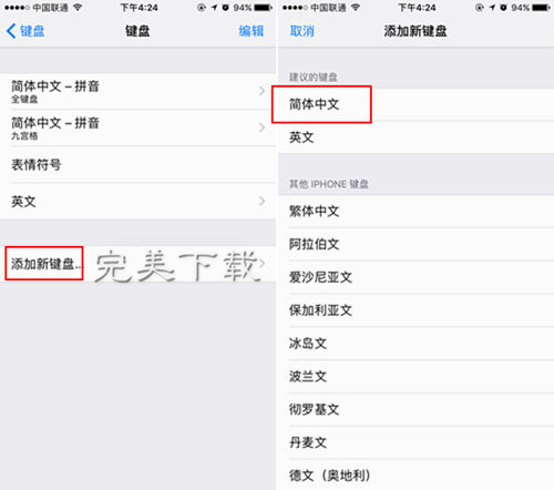 三、接下來進入的鍵盤頁面設(shè)置中,依次再次點擊【添加新鍵盤】---選擇【簡體中文】,如圖:
