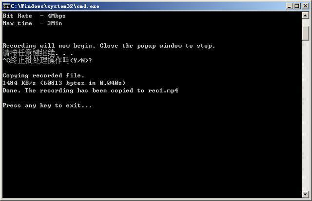 5、關(guān)閉第二個(gè)窗口,錄屏?xí)詣?dòng)停止,視頻會(huì)自動(dòng)保存在小工具所在的文件夾,并發(fā)送到手機(jī)的存儲(chǔ)空間,所以你也可以在手機(jī)上觀看錄屏。這是停止錄屏后,第一個(gè)窗口顯示的信息: