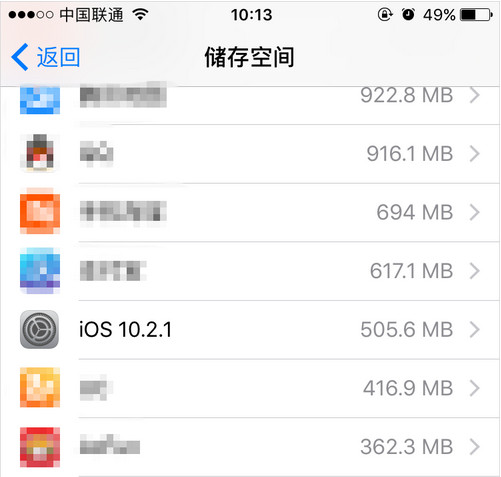 6、如果操作成功后仍提示更新,請在設備上打開【設置--通用--存儲空間與iCloud用量--管理存儲空間】,在里面找到對應版本的安裝包并刪除;