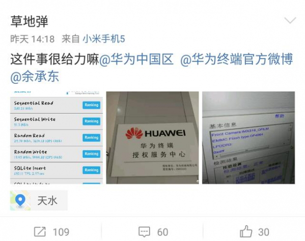 正當我們還在這里滿臉疑惑的時候,有網友疑似拿著華為P10前往華為終端授權服務中心進行檢測了,并給出了檢測結果,從圖中所給信息來看檢測結果為所用閃存就是型號為DF4064的EMMC閃存,這也是導致讀寫速度偏低的直接原因了。如果網友前往華為終端授權服務中心檢測一事做實,那么華為也是百口莫辯了,華為官方是會有進一步的說明,還是繼續保持沉默呢?看華為自己的態度了!