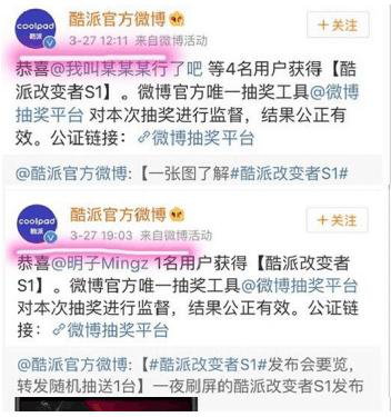 不過事情最后還算是給了用戶一個交代,@華為手機官方出面使用微博官方抽獎平臺重新對活動微博進行重抽結束了這場“硝煙”。不過很有意思的是,當時酷派官方就在同一天使用抽獎平臺,連續抽出了好幾條活動微博的中獎用戶,被網友發現了,也是蠻搞笑的一場鬧劇。