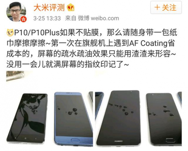 微博知名數碼博主@大米測評 曾在華為P10發布后發微博表示:P10/P10Plus如果不貼膜,那么請隨身帶一包紙巾摩擦摩擦~第一次在旗艦機上遇到AF Coating省成本的,屏幕的疏水疏油效果只能用渣渣來形容~沒用一會兒就滿屏幕的指紋印記了。這一微博一出,瞬間引起網友們的廣泛討論,各路微博數碼博主也是慢慢加入到討論當中,不過華為官方依然忍住了,沒有發出任何的說明。