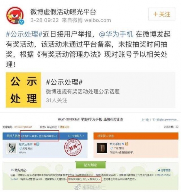 就在上個月,華為官方微博竟然遭到了微博官方抽獎平臺點名通報:@華為手機 在微博發起有獎活動,該活動通過平臺備案,未按抽獎時間抽獎,根據《有獎活動管理辦法》現對賬號予以相關處理!而處罰就是扣信用分10分,并禁言7天。然而讓人驚訝的卻是當天華為官方還是照常發微博,貌似完全不受影響,看得一眾網友蒙圈了。