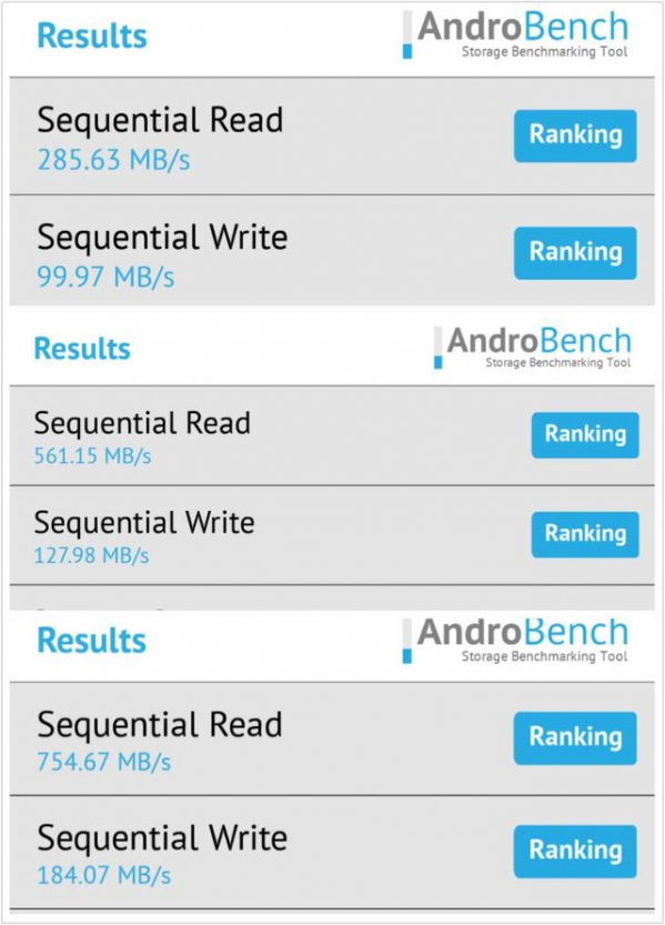真是禍不單行啊,這疏油層時間還沒有過去多久,緊接著華為P10就在今天又被曝出所謂的“閃存門”。這到底是怎么回事呢?原來啊,有細心地網友發現同為華為P10,經過測試卻發現測試得出的讀寫速度卻有天壤之別,讀寫速度280多MB/s、560多MB/S以及750多MB/s,有網友猜測這可能是由于華為P10 將EMMC 5.1/UFS2.0/UFS2.1三種閃存混著用導致的。