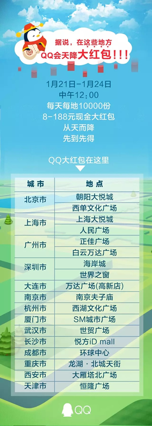1月21日到24日,每天中午12:00,在全國以下地方還有大額紅包等著你!