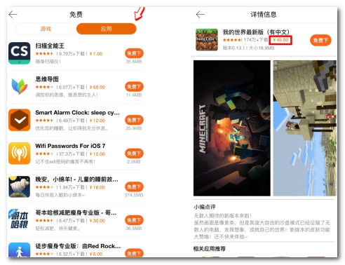也是樂8助手主打的特色之一了,app store收費的應用太貴了?那就點擊圖上紅色箭頭區域吧,找找有沒有你想要的應用,完全免費哦,選擇游戲標簽也能看到目前熱門的付費游戲哦,連官方商店售價45人民幣的minecraft也可以免費下載到,這么厲害的小助手,難道你不心動嗎?