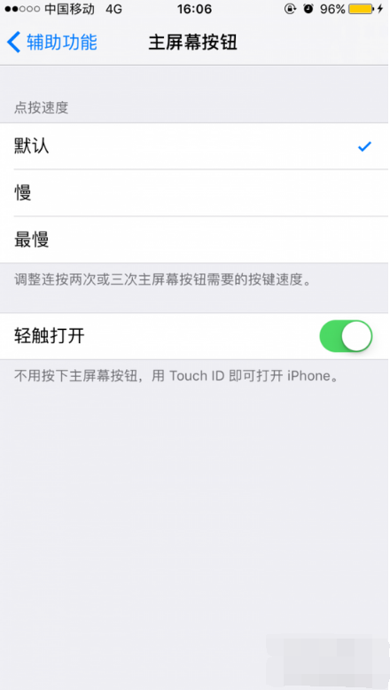 Iphone7的解鎖方式與先前幾款有所不同,之前是直接觸碰 Touch ID ,現(xiàn)在需要按一下 Home 鍵,如果想省去這一步驟,可以進入“設(shè)置→通用→輔助功能→主屏幕按鈕”,開啟“輕觸打開”就可以了。