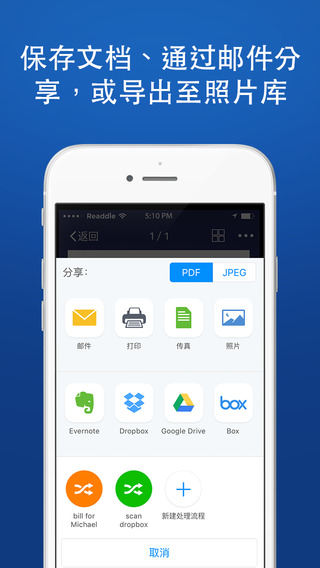 Scanner Pro by Readdle可以讓你方便地打印或將掃描的文檔通過郵箱發送出去,也能支持直接手機上發送傳真,不過通過手機發送的話是收費的哦。還有除了發郵件和傳真外,Scanner Pro 還能支持將掃描文檔直接上傳至 Evernote(印象筆記)、Dropbox、OneNote、等支持 WebDAV 協議的服務器里,非常方便。