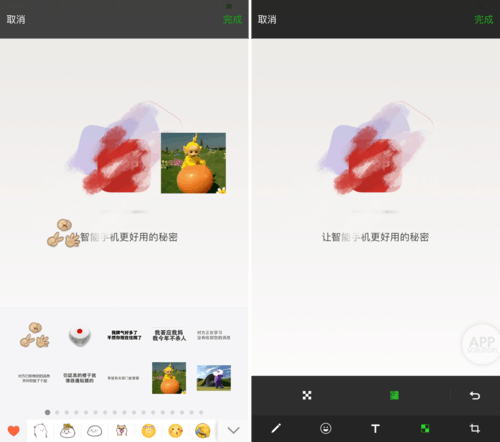 從左到右依次是涂鴉、添加表情、添加文字、馬賽克和裁剪。