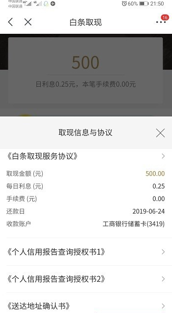 第五步點擊立即取現之后,需要同意協議,提現之后,金額會達到指定銀行卡,如下圖所示: