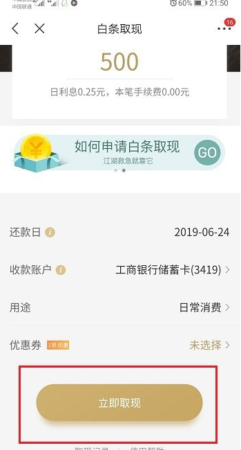 第四步進去白條取現界面,選擇提現的金額,需要注意的是白條提現是需要利息的,有時候首單會免息,點擊立即取現,如下圖所示: