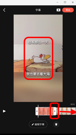 按住字幕拖動(dòng)到合適的位置,拖動(dòng)白色方框,可以設(shè)置字幕出現(xiàn)的時(shí)間,可以整個(gè)視頻都加上字幕,完成后“導(dǎo)出”即可。