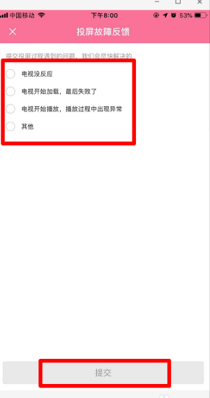 選擇投屏時的問題,比如電視沒反應等,然后點擊下方的“提交”。