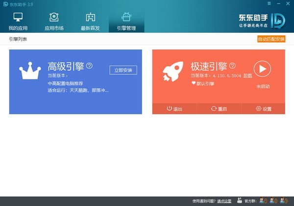 安裝完成后會自動運(yùn)行東東助手檢測系統(tǒng)環(huán)境,首頁會安裝引擎。注意:Win10系統(tǒng)用戶需安裝極速引擎,高級引擎目前暫不支持Win10系統(tǒng)!