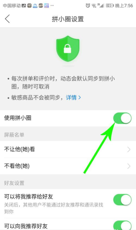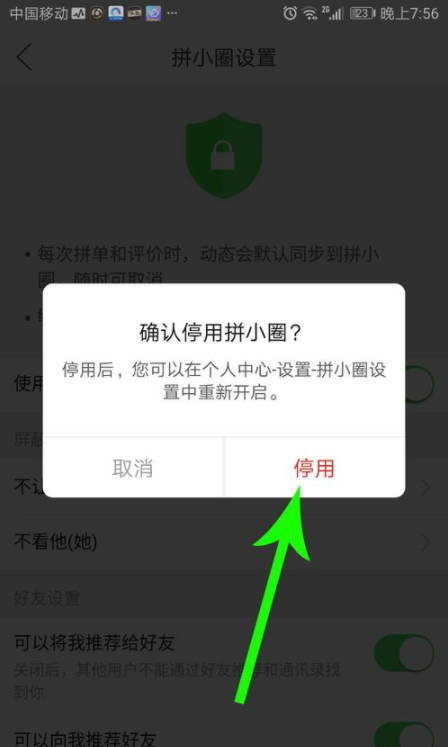 打開拼小圈設置界面點擊“使用拼小圈”右側的“開關”按鈕,打開提示彈窗后點擊“停用”即可退出拼小圈。