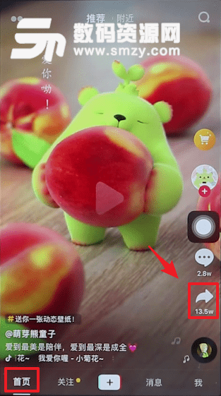 1、在抖音短視頻App首頁點擊視頻右側的【分享】按鈕;