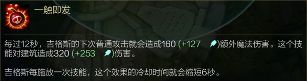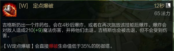 然后就是大家熟悉的W技能,Knight之所以選擇副W,是因為W點滿之后可以直接炸掉35%血量以下的防御塔(1級W能拆除25%血量以下的防御塔)。