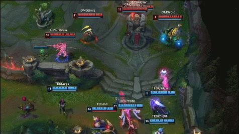 比賽中可以多次看到TES戰隊抱團消耗防御塔的局面,TES在中期之后就一直在避戰,然后靈活地轉線來形成對防御塔的攻勢,在推塔之前先POKE,同時抓機會打下路組合的控制鏈先手配合炸彈人大招抓先手減員的機會。