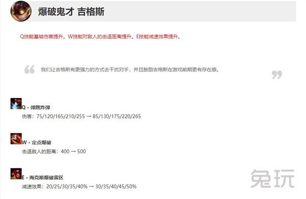 如圖所示炸彈人的加強幅度非常大,Q基礎傷害提升的結果是推線能力提升以及POKE/團戰能力的提升,W與E的控場能力提升,整體的作戰能力上升了一個檔次。
