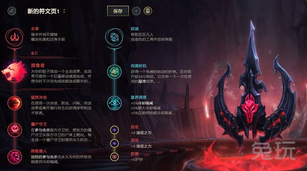 主系符文建議點主宰系,因為稻草人需要主宰系的猛然沖擊(提升雙穿)與終極獵人(減少大招的CD),核心基石符文選擇電刑或者掠食者,電刑追求更高的進場爆發(fā),而掠食者的主要作用是幫助稻草人更好地實現(xiàn)跑圖。