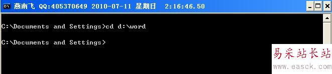例7、如果當前目錄是C:/Documents and Settings 要切換到 d:/word 在命令行輸入cd d:/word回車后再輸入d: 如下圖