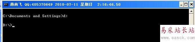 例4、如果想改變當前驅動器的目錄c:/documents and settings,進入到d驅動器默認目錄,在當前命令行輸入d: 執行后結果如下圖