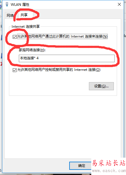 選中共享,勾選允許其他網咯用戶通過此計算機的Internet連接來連接,在家庭網絡連接下選中你創建的網絡