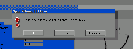 在快要結束的時候也會出現一個類似的窗口,要求用戶重新插入第1卷鏡像文件存儲介質,此處也有3個選項,“OK”、“Cancel”和“FileName?”。這是由于Ghost將硬盤的分區信息存儲在了第一卷鏡像文件的起始部分,而在備份進程結束時,還要對此信息進行更新,所以要求用戶重新插入第一卷鏡像文件的存儲介質。如果你始終采用同一存儲介質存放鏡像文件,在此直接點擊“OK”即可。至此,你也就完成了系統的分卷壓縮備份工作。