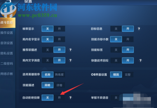 3.進入到戰斗信息的設置界面之后,我們就可以在界面底部看到自動拒絕投降這個功能了,然后我們點擊開關將它開啟。