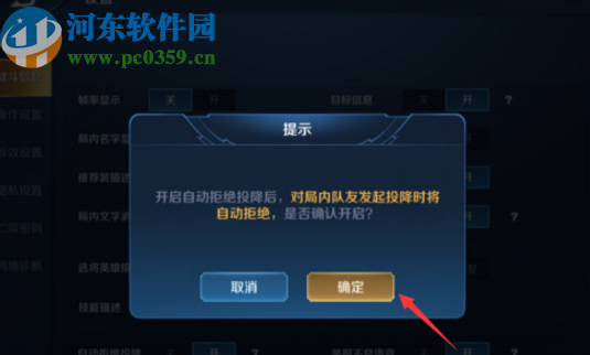 4.點擊開啟之后游戲中會出現一個提示界面,告訴我們開啟這個功能之后在對局中隊友發起投降的話會自動拒絕投降,確認開啟的話點擊確定按鈕即可。