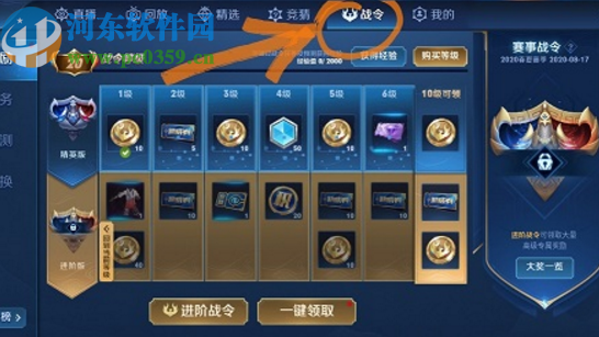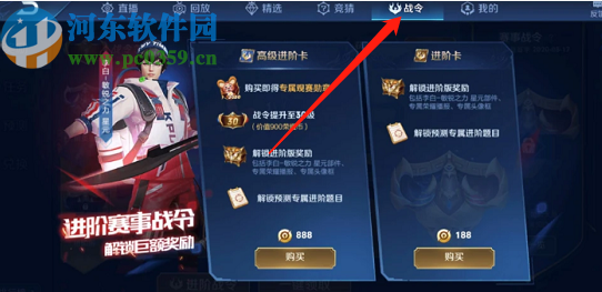 2.點擊進入到賽事之后在界面上方可以看到有一個戰令模塊,點擊進入之后會自動彈出戰令進階卡的購買界面,如下圖中所示。
