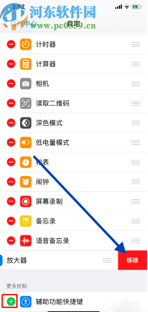 4.之后在自定控制界面,我們可以看到所有可以使用的圖標(biāo),點(diǎn)擊減號(hào)將該圖標(biāo)移除,點(diǎn)擊加號(hào)的話就添加該圖標(biāo)到控制中心,大家根據(jù)自己的需求設(shè)置即可。