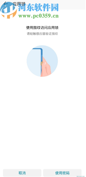 4.點擊進入到應用鎖功能之后會看到下圖所示的界面,然后我們用指紋在手機識別指紋的位置驗證指紋信息,驗證完成之后點擊使用密碼這個按鈕。