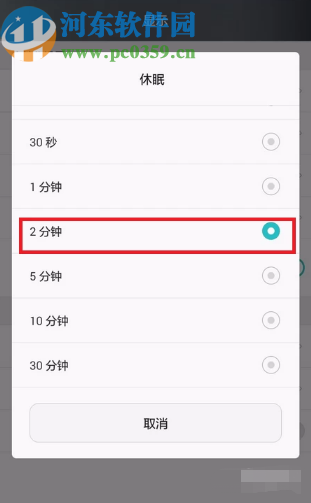 3.點擊之后在手機的界面下方就會出現讓我們選擇屏幕休眠時間的界面了,然后我們將30秒更換為2分鐘,然后點擊空白處即可保存選擇操作。