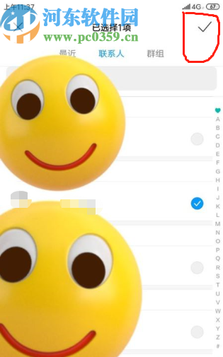 3.點擊添加之后獲取到手機通訊錄權限,進入到通訊錄中選擇要添加的緊急聯系人,我們在通訊錄列表中選中之后點擊右上角的勾。