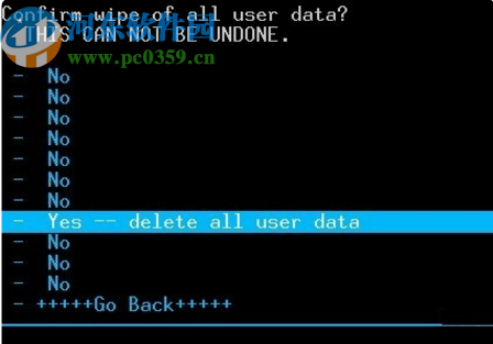 3.找到上個步驟的選項點擊選擇之后進入到清空數據的界面,然后我們在界面中會看到yes - delete all data這個選項,然后我們控制電源鍵選擇。