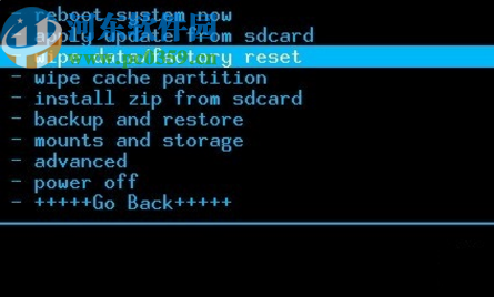 2.進入到recovery之后的界面如下圖所示,然后我們需要在其中找到wipe data/factory reset這個選項,用音量鍵來控制上下,電源鍵確認選擇。