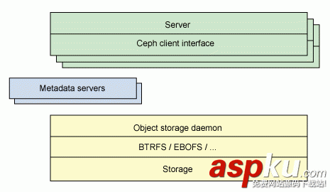 另一個架構視圖由圖 2 提供。一系列服務器通過一個客戶界面訪問 Ceph 生態系統,這就明白了元數據服務器和對象級存儲器之間的關系。分布式存儲系統可以在一些層中查看,包括一個存儲設備的格式(Extent and B-tree-based Object File System [EBOFS] 或者一個備選),還有一個設計用于管理數據復制,故障檢測,恢復,以及隨后的數據遷移的覆蓋管理層,叫做 Reliable Autonomic Distributed Object Storage(RADOS)。最后,監視器用于識別組件故障,包括隨后的通知。