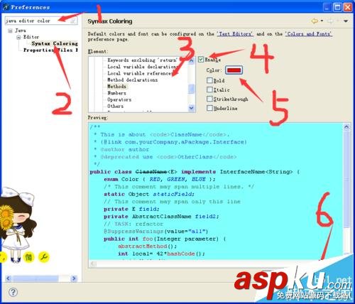2、同樣在window下面點開Preference對話框,我們這次不用一個個找,直接在搜索框輸入java editor color 然后選中Syntax Coloring (語法顏色)