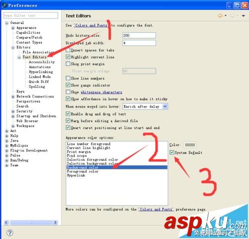 2、這次還是General 不過是在Editors下面找Text Editors ,這里注意觀察右邊出來的Background color (如果沒有 兩個原因 一是版本問題 二是選擇了Text Editors 下面的子選項)