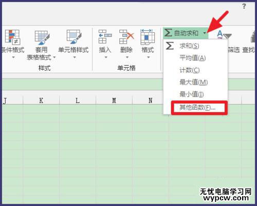 2、點(diǎn)擊【開始】-【自動求和】旁邊的三角,出現(xiàn)下拉菜單,點(diǎn)擊【其他函數(shù)】;