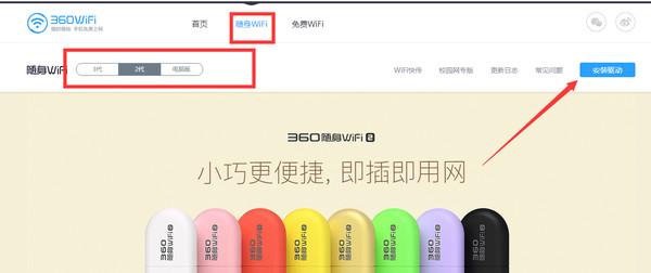 4.如果插入設(shè)備后電腦沒有開始自動(dòng)安裝驅(qū)動(dòng)程序,也可自己前往“http://wifi.360.cn/”,在網(wǎng)站首頁(yè)點(diǎn)擊隨身wifi,選擇好你購(gòu)買的產(chǎn)品類型,然后點(diǎn)擊“安裝驅(qū)動(dòng)”即可。