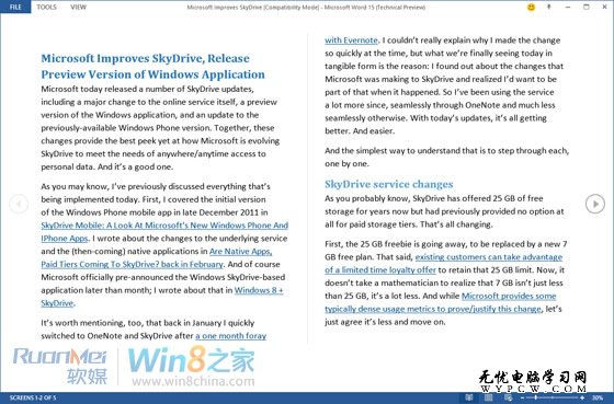 Winsupersite.com再次放出Office 15的界面截圖,Metro風格主打,并展示Office 15的新主題以及全屏模式、閱讀模式的界面,界面清新簡潔。針對平板電腦等觸摸設備,還將提供觸控模式。
