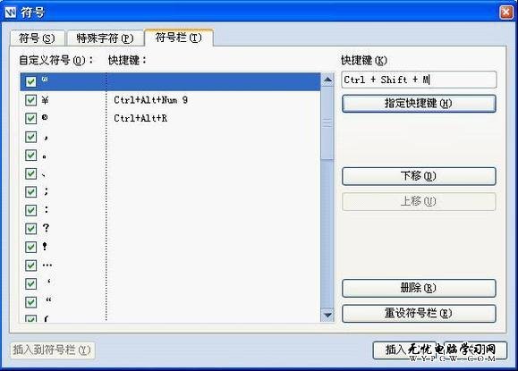 提示:我們也可以在“符號”對話框中給商標符號指定一個快捷鍵,方便我們日后使用時快速輸入。方法是在“特殊符號”選項卡下,先選擇相應的符號,然后單擊 “插入到符號欄”,再單擊“符號”選項卡,選擇剛才插入的符號并將光標定位到“快捷鍵”框中,在鍵盤中分別按下Ctrl、Shift、Alt按鍵中一個,再指定一個其它鍵,也可以利用三個按鍵中兩個和其它按鍵組合,然后單擊“指定快捷鍵”后(如圖4),最后關閉對話框退出即可。