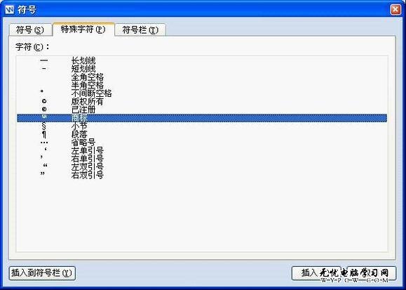 如果在“自定義”符號區(qū)中沒有看到,此時我們可以單擊“其它符號”,然后在打開“符號”對話框中,單擊“特殊符號”選項卡,就可以看到商標符號了(如圖3),雙擊鼠標即可插入到文檔中。