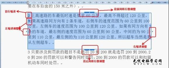 單擊“段落布局”圖標后,段落被選中同時圍以矩形框。一般的段落調整靠它就可以完成。 首行縮進及左、右縮進:將鼠標移至矩形框左上角首行的短豎線,鼠標指針變成雙向箭頭形式。拖動鼠標就可以調整首行縮進的字符數。其下方的短豎線是用來調整左縮進字符數的。移動鼠標至左右兩側的小三角形處,拖動矩形框左右兩條豎線,可以調整左、右縮進字符數。