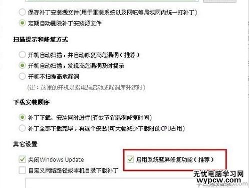 在漏洞修復界面,點擊右下角的設計按鈕,勾選啟動系統藍屏修復功能。這樣以后如果是安裝系統補丁引起的問題就可以在啟動電腦,啟動選擇菜單時,選擇啟動菜單中第二項“系統藍屏修復”功能了。