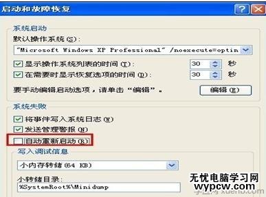在系統失敗選項下將“自動重新啟動”的復選框去掉,然后一路單擊“確定”按鈕使設置生效。
