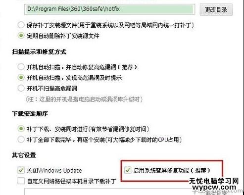 步驟三:在漏洞修復界面,點擊右下角的設計按鈕,勾選啟動系統藍屏修復功能。這樣以后如果是安裝系統補丁引起的問題就可以在啟動電腦,啟動選擇菜單時,選擇啟動菜單中第二項“系統藍屏修復”功能就可以進入修復電腦藍屏自動重啟的問題了。